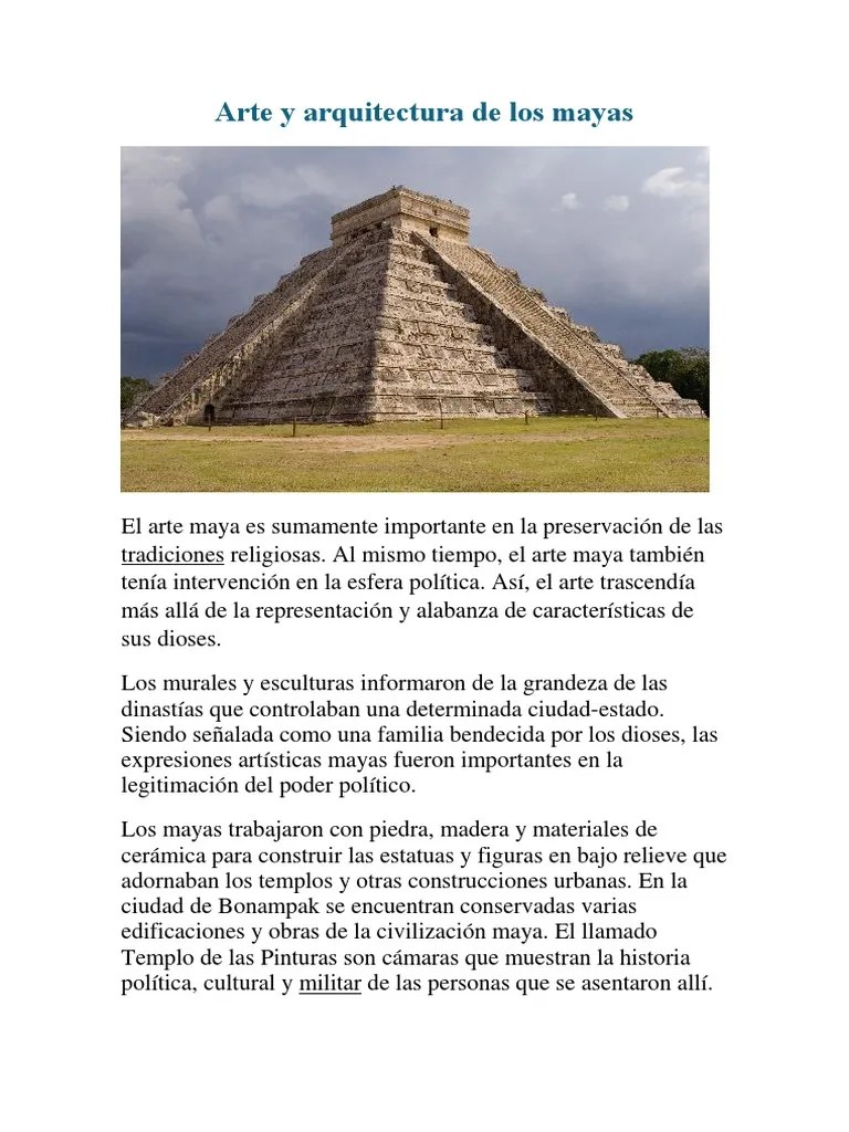 Los artistas mayas fueron excepcionalmente hábiles en escultura y tallado de piedra.. El arte maya es sumamente importante en la preservación de las tradiciones religiosas. La arquitectura maya durante el período clásico (lo que nos interesa) se trata de tres temas importantes en mi opinión: Las estructuras y técnicas de construcción; Al mismo tiempo, el arte maya también tenía intervención en la esfera política.así, el arte trascendía más allá de la representación y alabanza de características de sus dioses. Este trabajo le permitió la compilación de un banco de datos sobre arquitectura maya, que rebasño las cinco mil cuartillas de textos. El profesor andrews encabezó en 1960 un programa de reconstrucción y documentación de todos los sitios del área de las tierras bajas mayas. Las artes el arte maya clásico (200 a 900 d.c.) es apreciado por su excelente manufactura. Y la expresión religiosa y …
